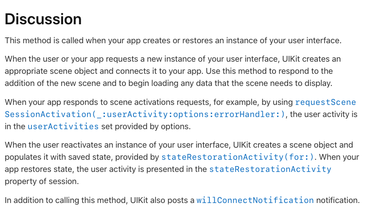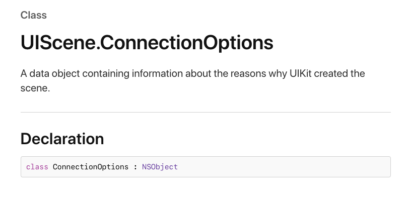 - scene을 생성하는데 세부적인 이유가 있을 경우, UIKit은 UIScene.ConnectionOptions 객체에 연관된 데이터를 채우고 연결 시간에 당신의 delegagte에 전달합니다.
