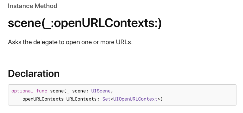 - 13 버전 이상 , func scene(_ scene: UIScene, openURLContexts URLContexts: Set<UIOpenURLContext>)