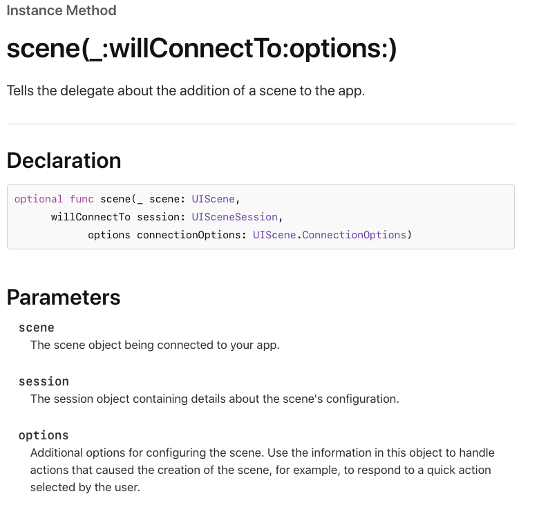 구글링 중 , 13 버전 이상일 경우 scene(_:willConnectTo:options:) 매서드에서 deepLink로 전달되는 URL을 얻을 수 있다는 정보를 얻었습니다. 그래서 이를 확인하기 위해 Apple Document Doc에 들어가서 해당 매서드에 대한 설명을 정리 해봤습니다.