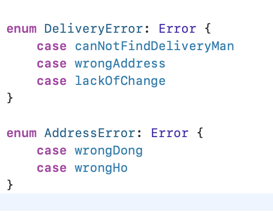 - Swift의 열거형은 특별히 이런 관련된 에러를 그룹화하고 추가적인 정보를 제공하기에 적합