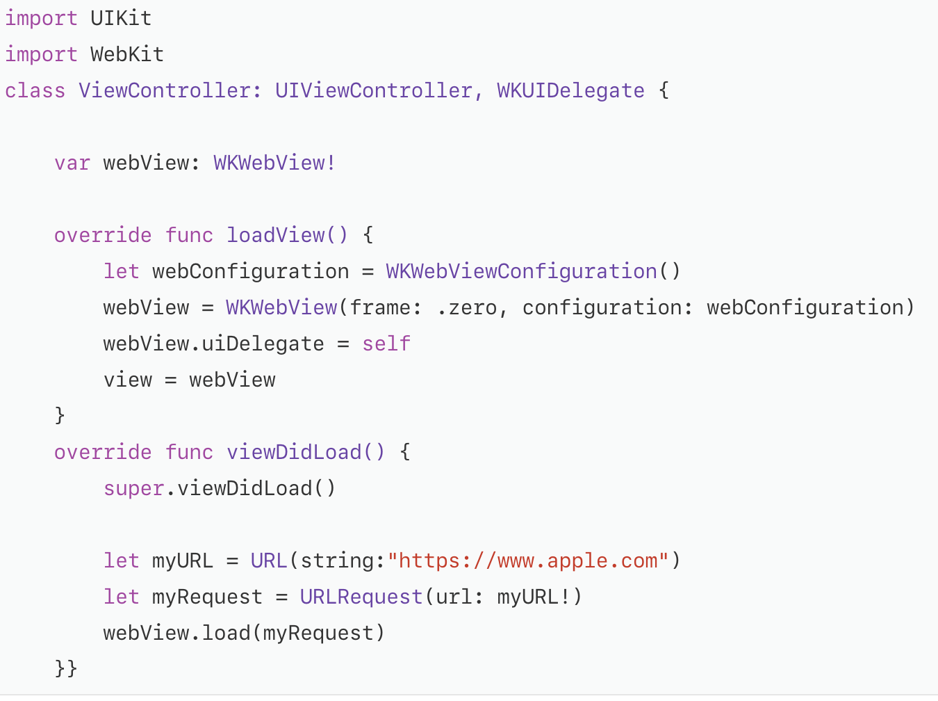 To do so, create a WKWebView object, set it as the view, and send it a request to load web content.
